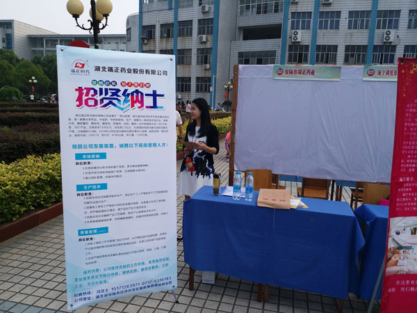 2017年5月20日我公司代表參加湖北職業(yè)技術(shù)學(xué)院2017年醫(yī)護類招聘,此次招聘主要崗位有:市場營銷、生產(chǎn)技術(shù)、質(zhì)量管理等,為廣大畢業(yè)生提供了就業(yè)機會,提供優(yōu)越的工作環(huán)境,免費提供住宿、享受國家規(guī)定節(jié)假日休息,繳納五險,提供全勤獎、工齡工資、生日補貼等福利待遇,受到了學(xué)生們熱情的追捧,紛紛遞上自己個人求職申請表,希望加入湖北端正藥業(yè),成員這個大家庭的一員。